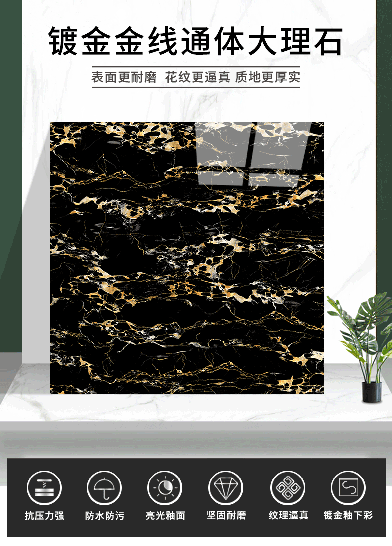 金線金粉 【產(chǎn)品介紹】航天級激光鍍金工藝,鉆石雕刻技術(shù),高溫慢燒,釉層不吸污吸水率低,真空鍍金燒成后再進(jìn)行真空電鍍工藝,平整如鏡面,精拋細(xì)磨,磚面平整光滑細(xì)膩光澤度、亮度、硬度較高。立體紋理,釉下彩工藝,三次淋釉增加磚面的立體感。