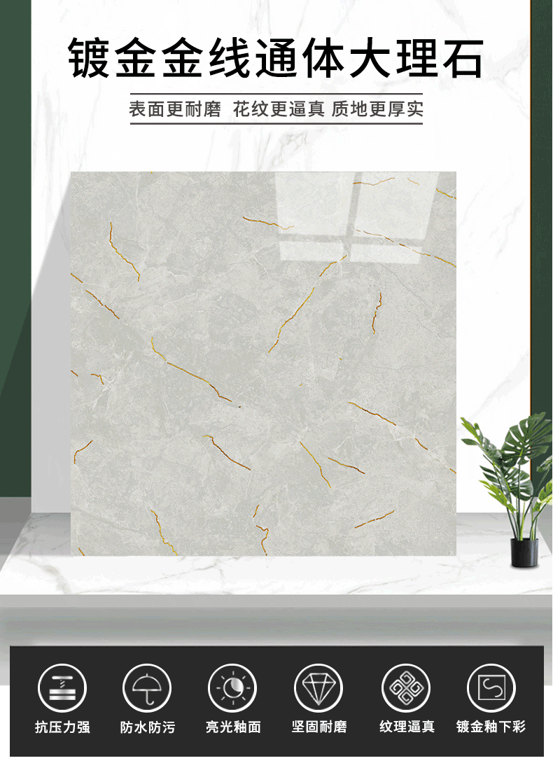 金線金粉 【產品介紹】航天級激光鍍金工藝,鉆石雕刻技術,高溫慢燒,釉層不吸污吸水率低,真空鍍金燒成后再進行真空電鍍工藝,平整如鏡面,精拋細磨,磚面平整光滑細膩光澤度、亮度、硬度較高。立體紋理,釉下彩工藝,三次淋釉增加磚面的立體感。