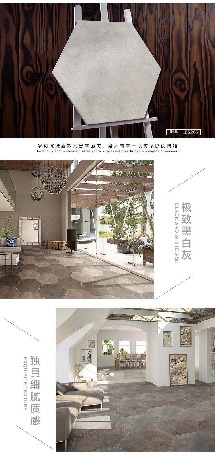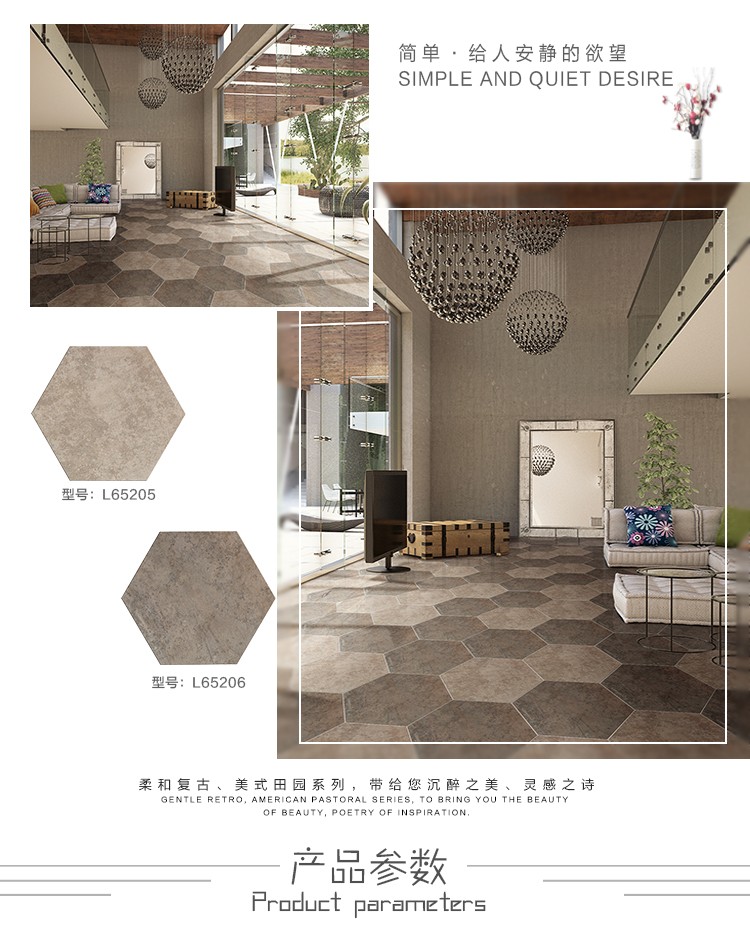 金曼古瓷磚廠家六角磚是一種表面呈現木紋裝飾圖案的環保建材.紋路逼真、自然樸實、沒有木地板褪色、不耐磨等缺點;曼古陶瓷木紋磚系列線條明快,圖案清晰為特色。本身具有阻燃,不腐蝕的特點,綠色、環保型建材;產品使用壽命長,耐磨,無需像木制產品那樣周期性地打蠟保養等。