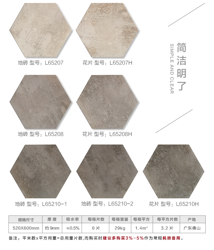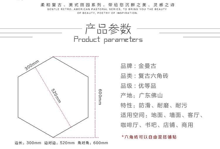 金曼古瓷磚廠家六角磚是一種表面呈現木紋裝飾圖案的環保建材.紋路逼真、自然樸實、沒有木地板褪色、不耐磨等缺點;曼古陶瓷木紋磚系列線條明快,圖案清晰為特色。本身具有阻燃,不腐蝕的特點,綠色、環保型建材;產品使用壽命長,耐磨,無需像木制產品那樣周期性地打蠟保養等。
