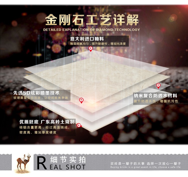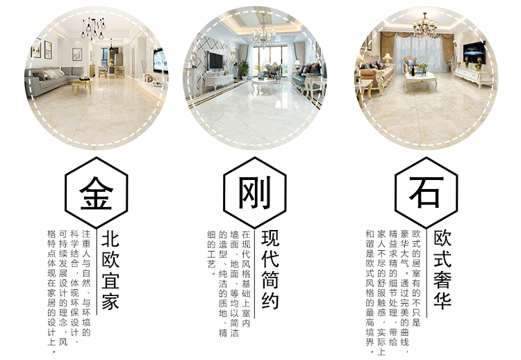 金曼古瓷磚廠家特價金剛石因高品質而得名,是一款極具天然石材效果和微晶石質感的仿石材瓷磚,它不但在價格、環保、耐用和清潔上極具優勢,在質感、規格、花色、重量等指標上,金剛石都遠遠勝于石材、拋光磚。相比其他種類的產品,它最大的特點可以用“高亮度、高耐磨、高平整、高逼真、高清晰、高環保”。