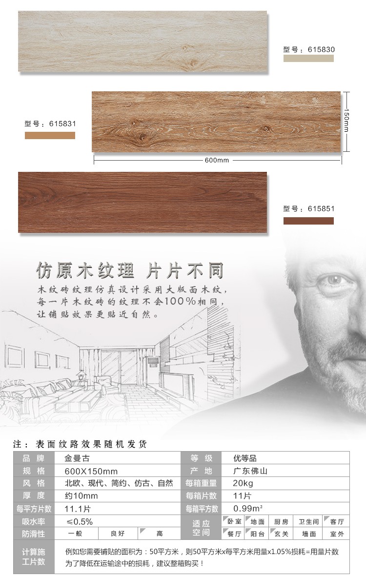 金曼古木紋磚,是一種表面呈現木紋裝飾圖案的環保建材.紋路逼真、自然樸實、沒有木地板褪色、不耐磨等缺點;曼古陶瓷木紋磚系列線條明快,圖案清晰為特色。本身具有阻燃,不腐蝕的特點,綠色、環保型建材;產品使用壽命長,耐磨,無需像木制產品那樣周期性地打蠟保養等.