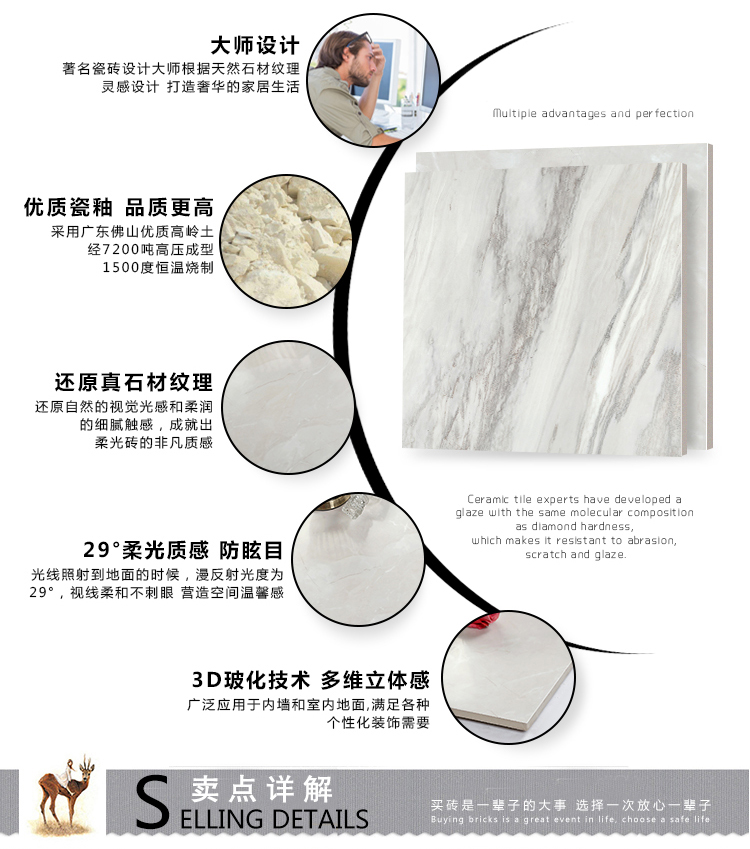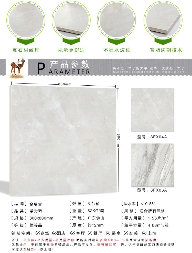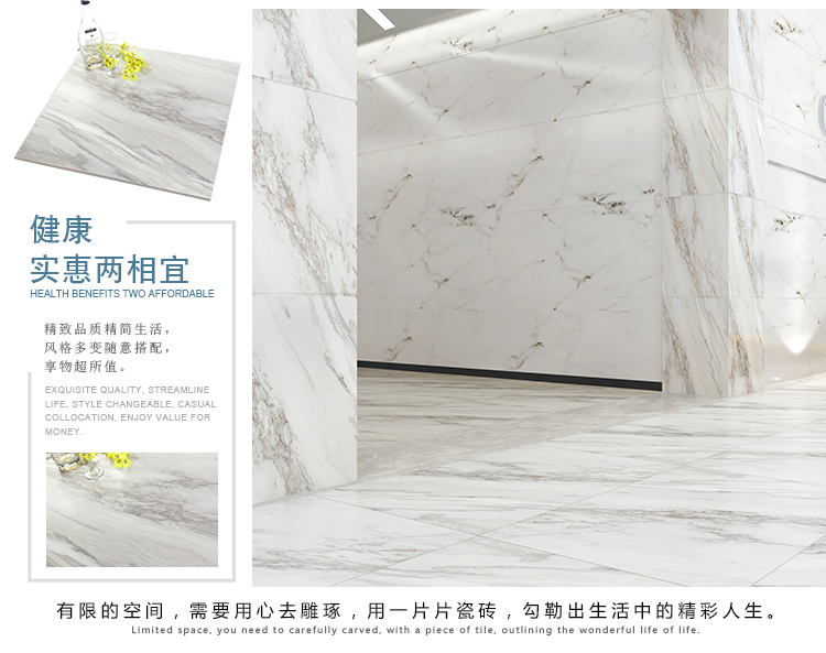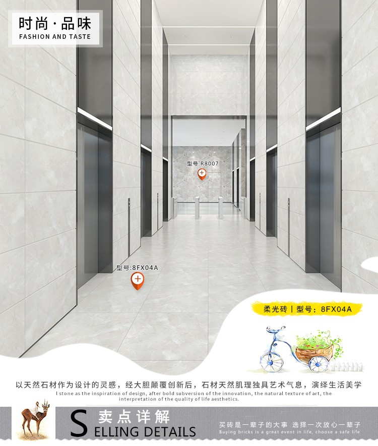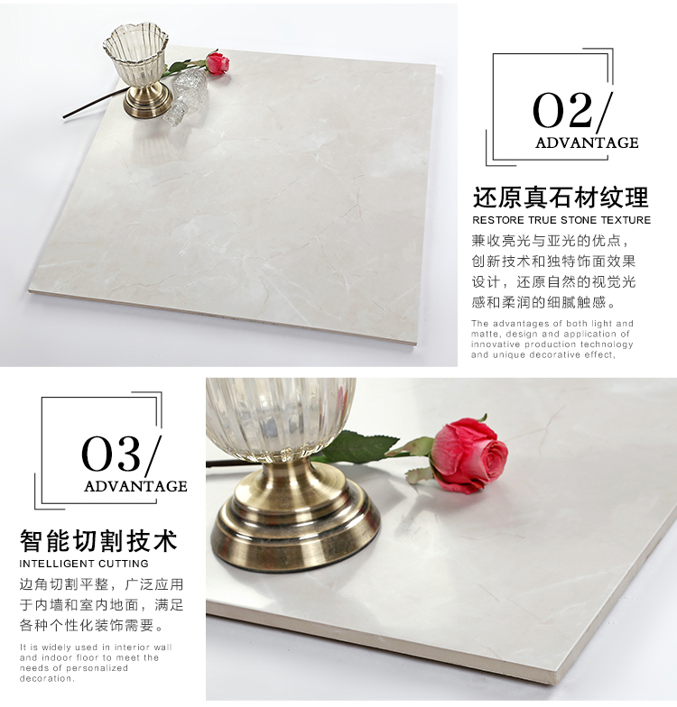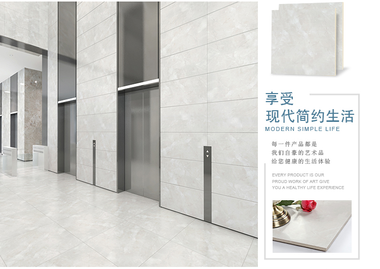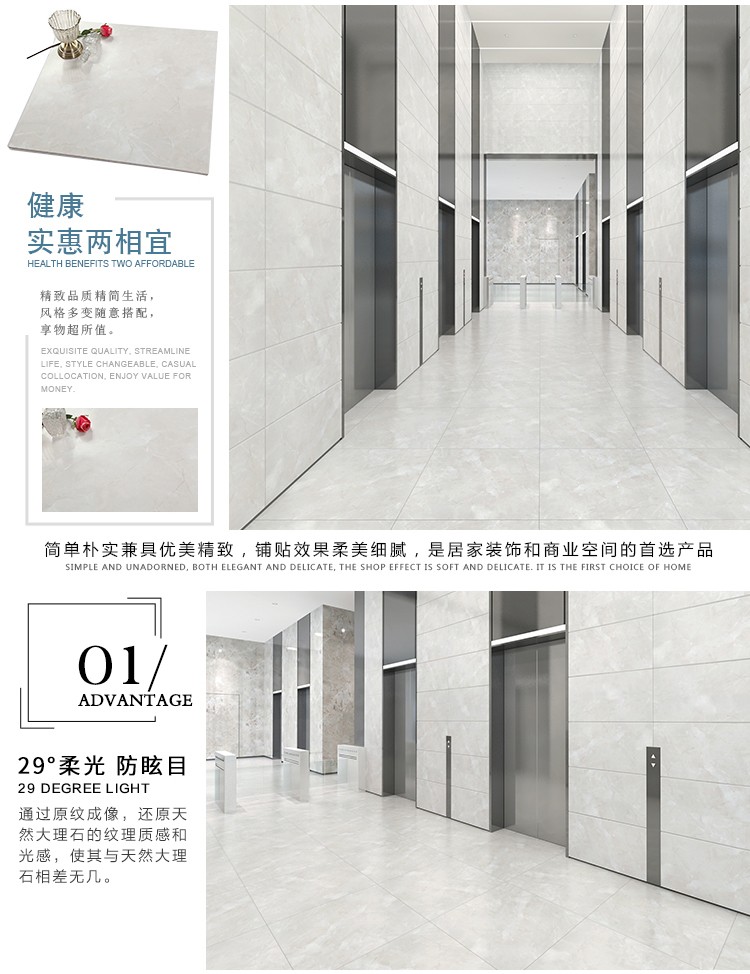 柔光瓷磚是磚面反射介于強(qiáng)光與弱光之間的一類瓷磚,其結(jié)合亮光類瓷磚的高調(diào)明艷裝飾和啞光類瓷磚的低調(diào)內(nèi)斂搭配效果,通過(guò)動(dòng)態(tài)柔光蠟拋技術(shù),降低產(chǎn)品反光率,從而達(dá)到人體舒適的視覺感受以及無(wú)光污染的空間裝飾效果。優(yōu)點(diǎn):1.視覺舒適,無(wú)光污染 2.堅(jiān)固耐磨,不易刮花.