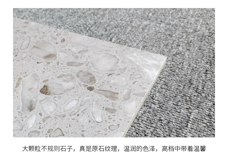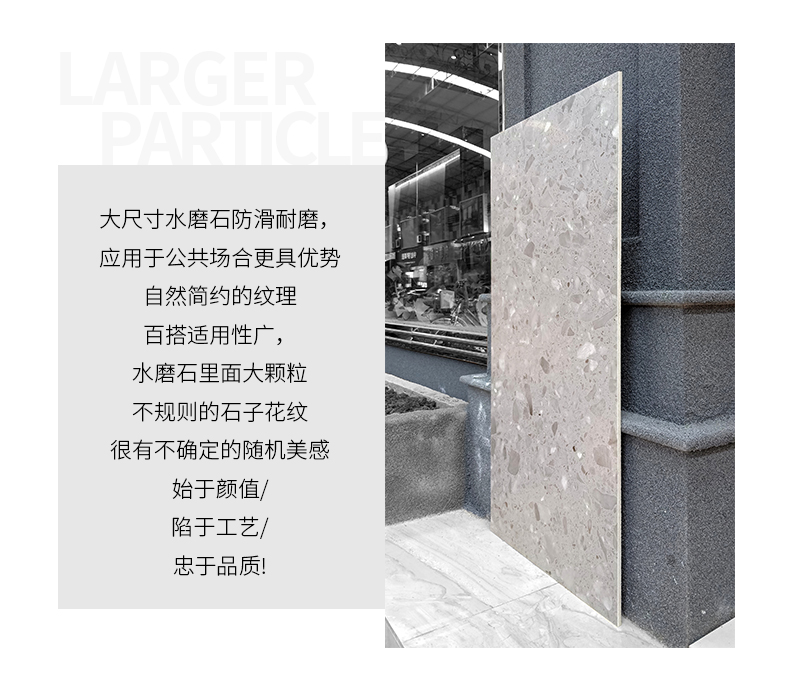 大尺寸水磨石防滑耐磨,應(yīng)用于公共場合更具優(yōu)勢,自然簡約的紋理,百搭適用性廣,水磨石里面大顆粒,不規(guī)則的石子花紋,很有不確定的隨機美感。始于顏值/陷于工藝/忠于品質(zhì)!