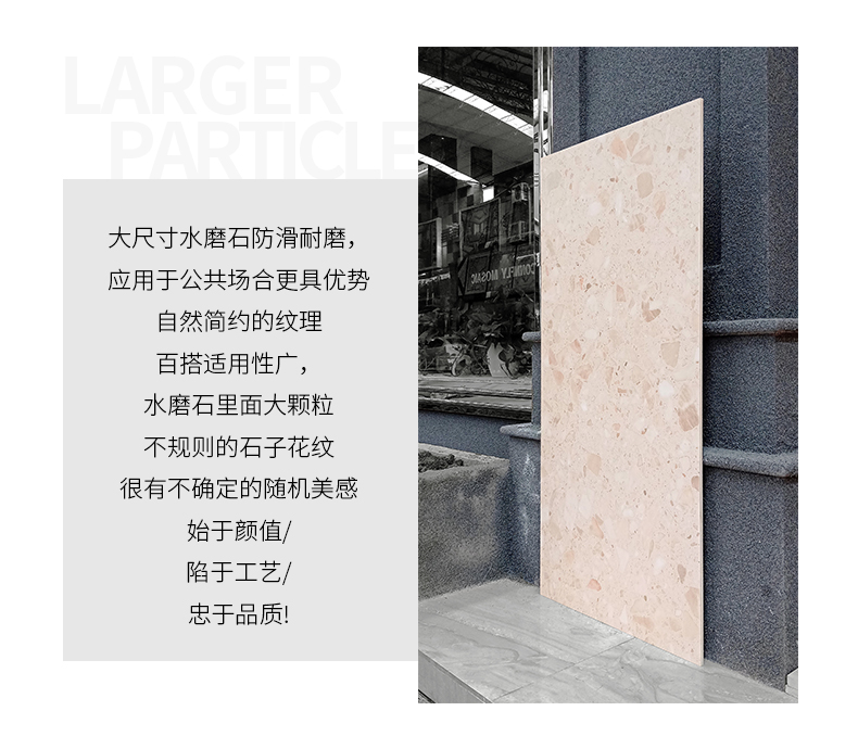 大尺寸水磨石防滑耐磨,應用于公共場合更具優(yōu)勢,自然簡約的紋理,百搭適用性廣,水磨石里面大顆粒,不規(guī)則的石子花紋,很有不確定的隨機美感。始于顏值/陷于工藝/忠于品質(zhì)!