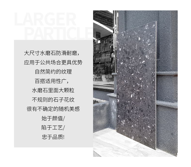 大尺寸水磨石防滑耐磨,應用于公共場合更具優(yōu)勢,自然簡約的紋理,百搭適用性廣,水磨石里面大顆粒,不規(guī)則的石子花紋,很有不確定的隨機美感。始于顏值/陷于工藝/忠于品質!