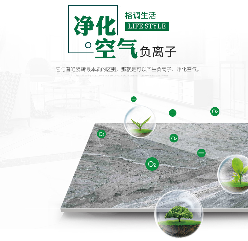 金曼古負離子瓷磚,能持續產生負離子,提高居室內空氣負離子濃度,改善室內空氣質量,提升人體健康水平。負離子被稱為空氣維生素,負離子瓷磚創造安全健康的空間環境。工程用磚全拋釉地磚、通體大理石瓷磚、金剛石地磚等支持加工定做家裝瓷磚批發。