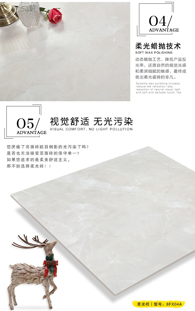 柔光瓷磚是磚面反射介于強光與弱光之間的一類瓷磚,其結合亮光類瓷磚的高調明艷裝飾和啞光類瓷磚的低調內斂搭配效果,通過動態柔光蠟拋技術,降低產品反光率,從而達到人體舒適的視覺感受以及無光污染的空間裝飾效果。優點:1.視覺舒適,無光污染 2.堅固耐磨,不易刮花.